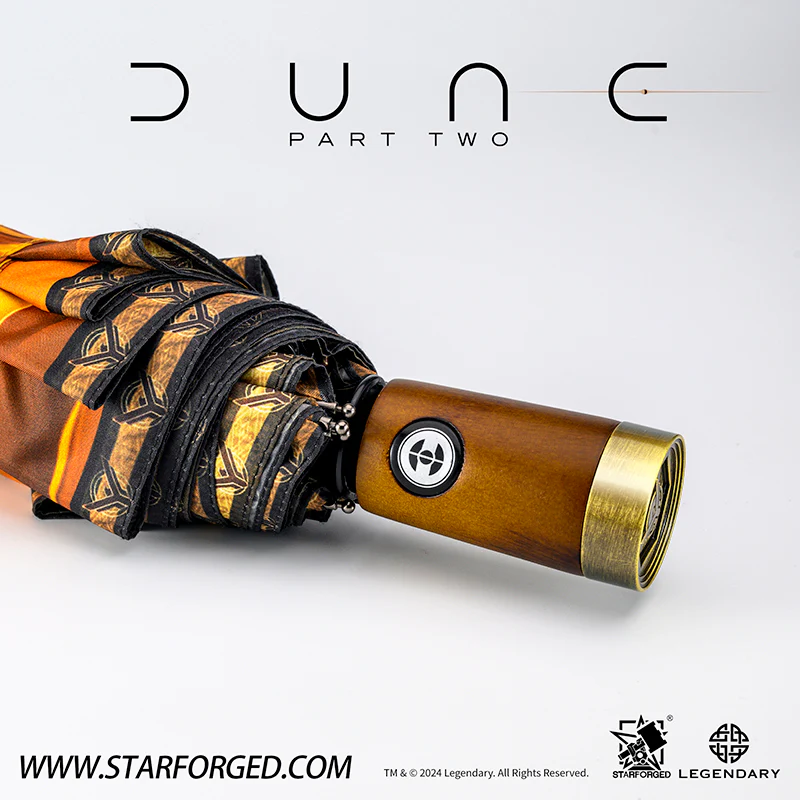 An automatic umbrella, the surface of the umbrella cloth is printed with the dune theme, and the inside of the umbrella cloth is the giant mouth of a sandworm, implying the danger hidden on the surface of the dune. The umbrella handle is made of imitation wood structure, and the base is made of alloy, engraved with the symbol of Atreides.